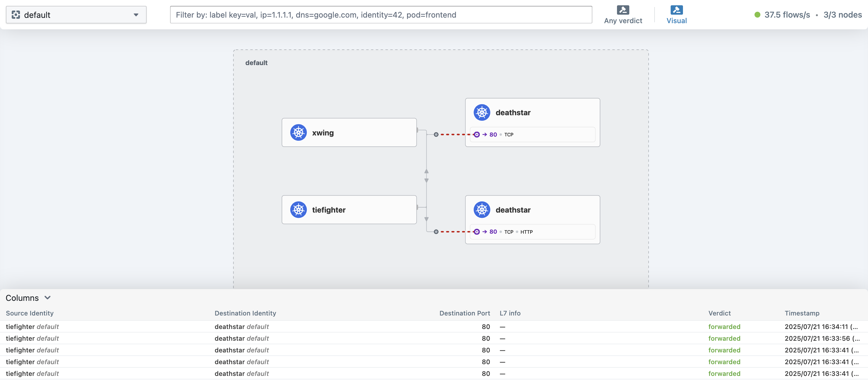- kubernetes 의 network policy 와 다르게 cilium network policy 는 기본 all all deny 정책이 적용됩니다.