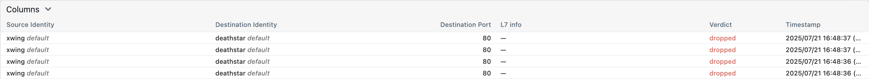 (deathstar 클래스 레이블이 적용되어 있는 pod 에 ingress 정책이 enable 되어 있는 것을 볼 수 있습니다.)