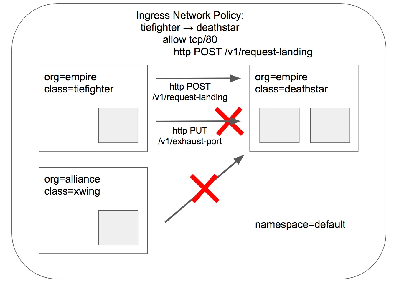 같은 empire org 에서 오는 네트워크 패킷만 허용하는 네트워크 정책으로 나머지 패킷들은 모두 드랍되는 정책을 생성하여 적용합니다.