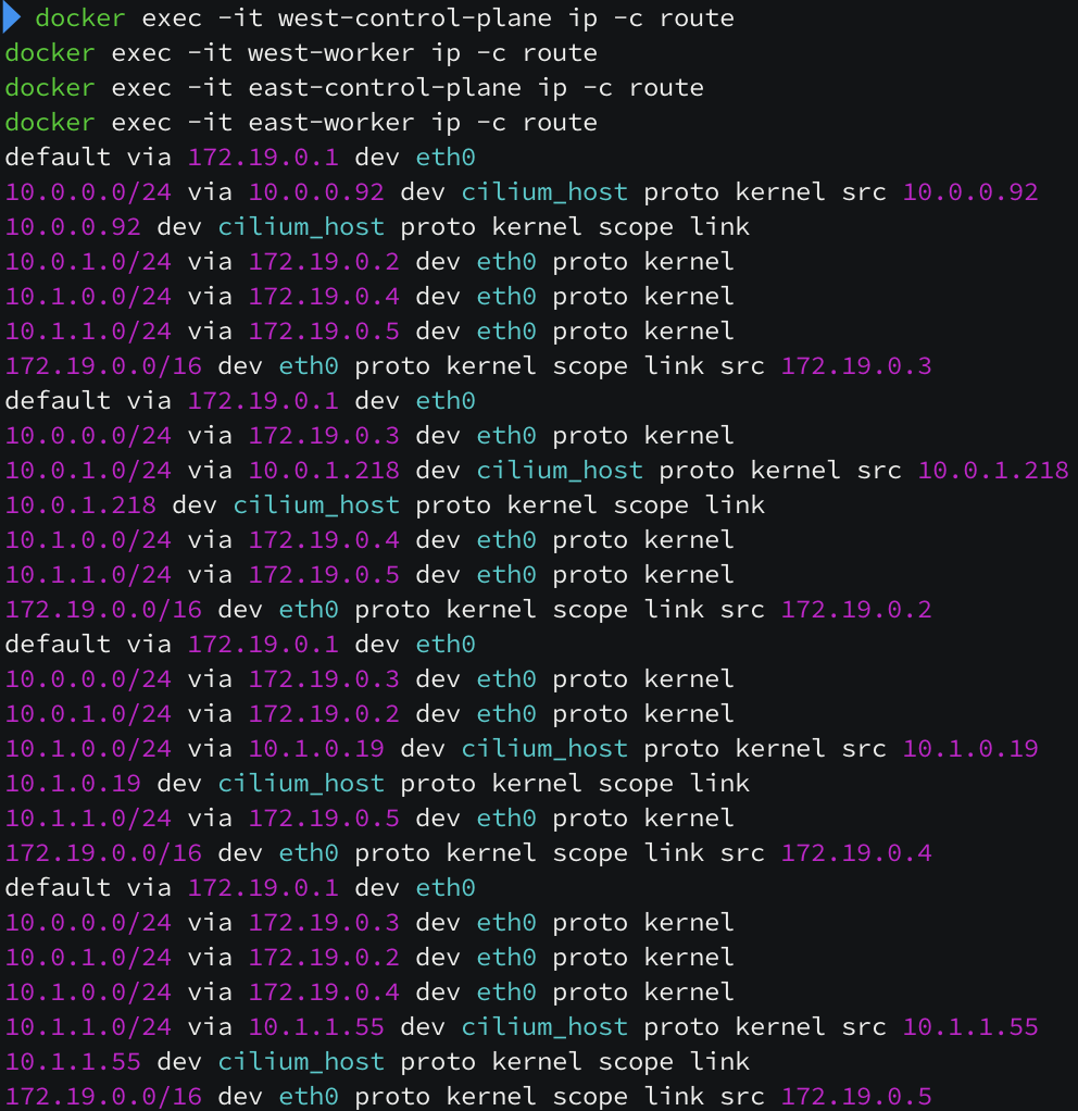 네트워크 설정 시, 보통은 podCIDR 대역을 노드의 라우팅 테이블에 넣어주어야 하는데 native routing 모드이고 cluster mesh 를 구성할 때 자동으로 라우팅을 주입해줍니다. 노드 OS 라우팅 테이블에 라우팅이 되어 있지 않은데도 통신이 정상적으로 됩니다.