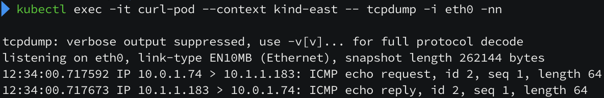 kind-west 에서 kind-east 의 curl-pod 로 ping 요청을 해보니 통신도 정상적으로 수행됩니다!