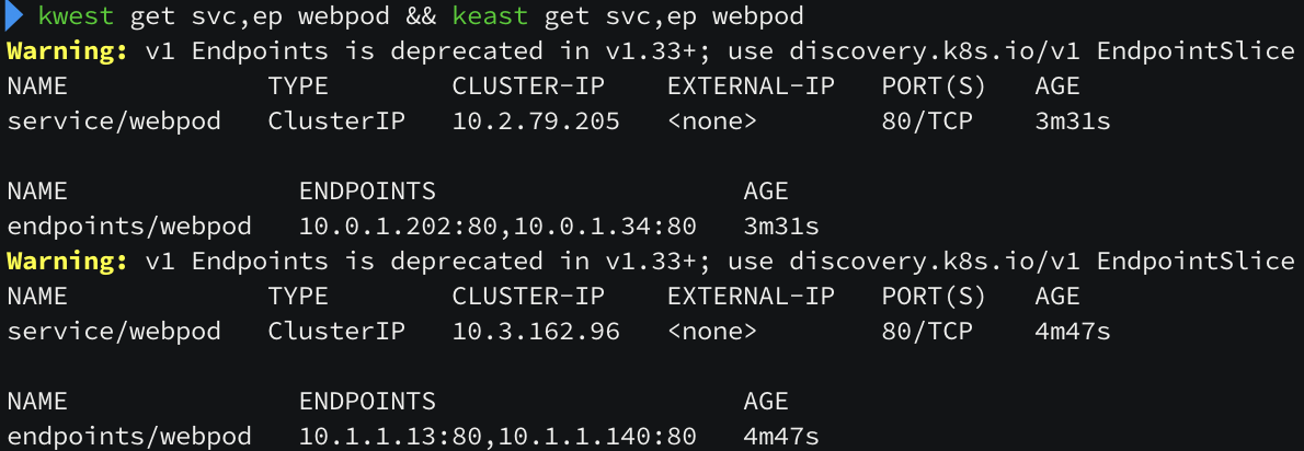 west 나 east 의 어떠한 서비스 IP 로 호출하더라도 모든 west 와 east 의 pod 엔드포인트 IP 가 호출될 수 있음을 확인할 수 있습니다.