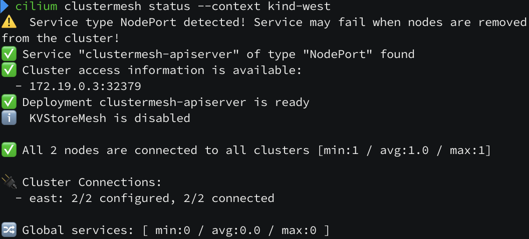 cilium clustermesh enable --service-type NodePort --enable-kvstoremesh=false --context kind-west