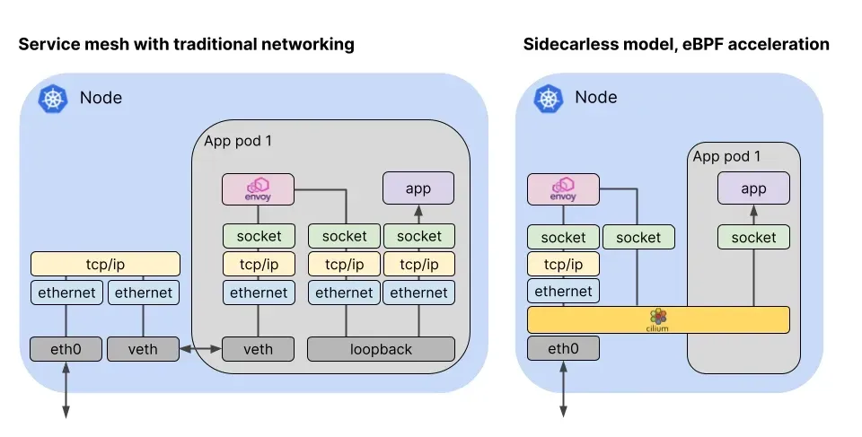 (좌측) 전통적인 서비스 메시의 경우(ambient 모드 X) envoy 사이드카 패턴으로 한 번의 네트워크 스택을 거쳐야 했습니다.