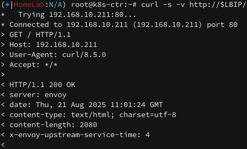 정상적으로 ingress 정책에 따라 통신이 되고 있습니다. -v 옵션을 주어서 자세히 보면 envoy 서버를 경유해서 x-envoy-upstream-service-time 이라는 특정 헤더가 세팅되는 것을 확인할 수 있습니다. (외부에서 접근하면 x-forwarded-for 헤더로 source-ip 를 기재하게 됩니다.)