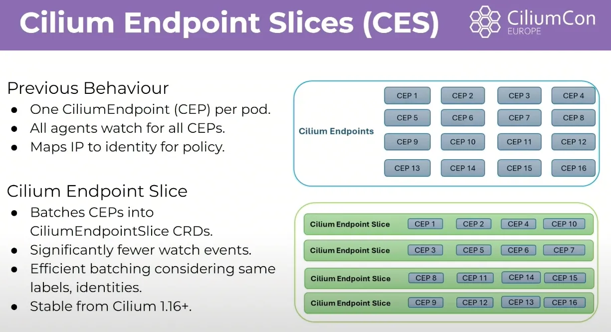 | watch 대상 | 파드 별 endpoint | CiliumEndpointSlice CRD 에 정의된 파드 |