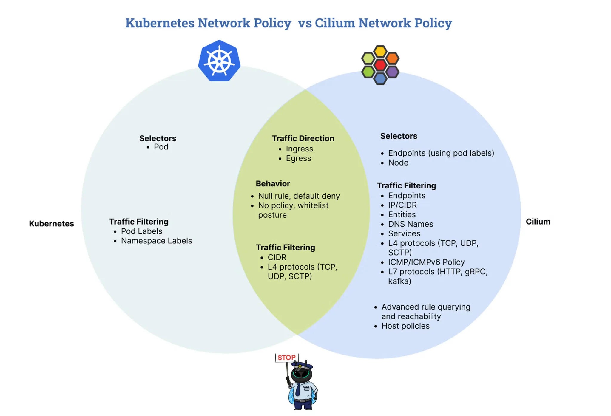 Cilium 은 표준 Kubernetes 의 Network Policy 보다 더 많은 기능을 제공합니다.