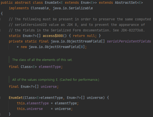 맨 마지막 EnumSet 생성자 보면 접근 제한자가 없다. 같은 패키지 내에서만 호출될 수 있다.