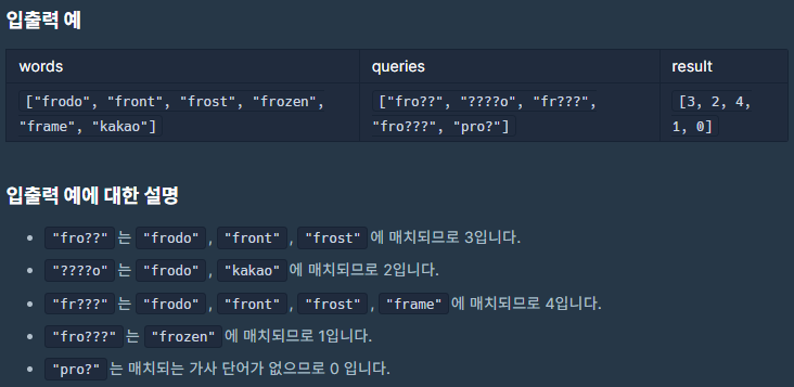 트라이 자료구조를 통해 링크드 리스트처럼 문자열들을 O(M) (여기서 M은 문자열의 길이) 복잡도로 탐색한다. 주의할 점은 트라이 자료구조를 사용한다고 하더라도 '?' 를 만나면 그 다음 문자 26 가지 알파벳들을 모두 탐색해야 하므로 비효율적이다. '?' 는 중간에는 사용하지 못 한다는 특징을 이용하여 트라이 자료구조를 '?' 전까지만 탐색하고 '?' 를 만나면 더 이상 트라이를 탐색할 필요없이 문자열의 길이를 가진 또 다른 문자열이 있는지 파악하고 그 갯수를 리턴하면 된다. 그래서 트라이 자료구조와 함께 문자열의 길이를 키로 가지고 갯수를 값으로 가지는 Map 자료구조를 같이 셋팅한다.
