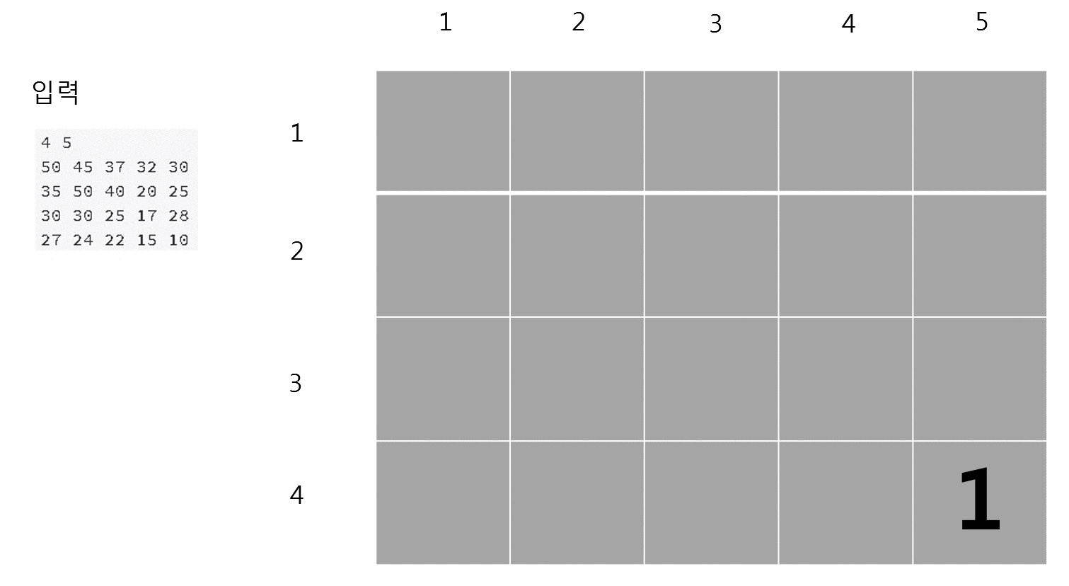 지도의 각 칸에는 그 지점의 높이가 주어지며 (0, 0) 지점에서 (n-1, m-1) 지점으로 내려가려고 한다. 항상 높이가 더 낮은 지점으로만 이동하여 목표 지점까지 가고자 할 때 이동할 수 있는 경로의 수를 구하시오.