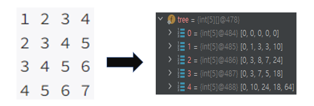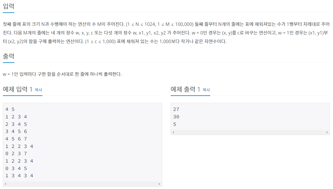N×N 크기의 표에 숫자들이 채워져 있다. 수의 변경이 빈번히 일어나고 연속 구간에 대한 부분합을 구하려고 한다.
