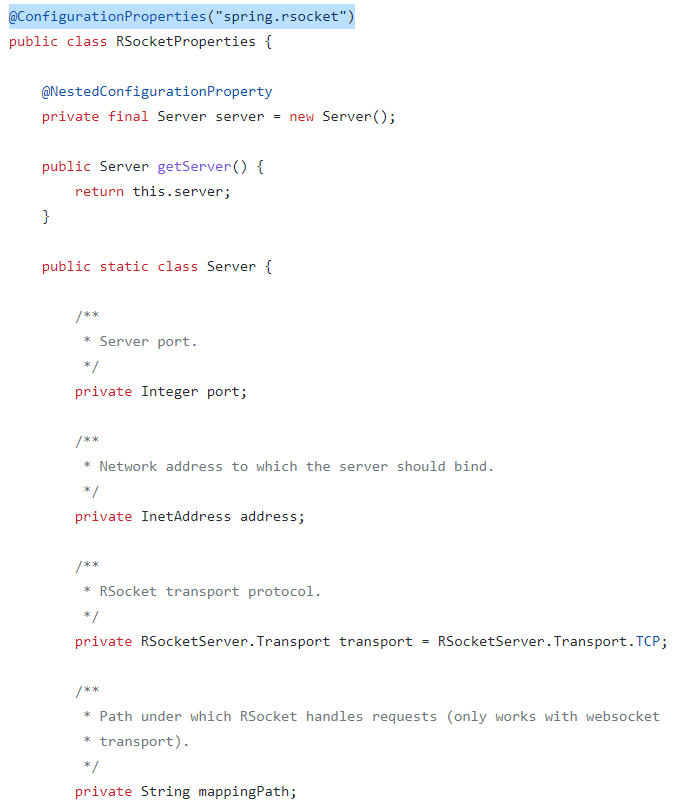 예를 들어, rsocket 관련 spring boot 설정 값들을 보고 싶다면, 위 github 에서 rsocket 관련 소스코드를 찾아 @ConfigurationProperties 어노테이션이 선언된 클래스를 확인하면 된다.