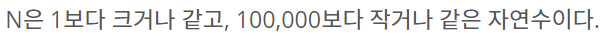 Fact 1 : 숫자를 받을 때마다 그 리스트를 정렬하여 중간 값을 가지고 오면 문제는 쉽게 풀린다. 다만 지문에서 확인할 수 있듯이, 아래와 같이 N 이 최대 100,000 이며, 받을 때마다 정렬하면 매번 O(N) 시간이 소요된다. 이러면 시간제한인 0.1초를 해결할 수 없을 것이다. 0.1초라는 시간을 만족하려면 삽입할 때마다 정렬하는 시간도 줄여야 하고 중간 값을 탐색하는 시간도 줄여야 한다. 정렬, 탐색 시간을 모두 줄여야 한다.