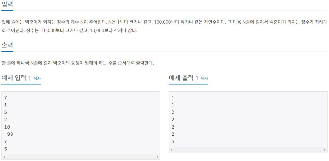 첫째 줄에는 백준이가 외치는 정수의 개수 N이 주어진다. N은 1보다 크거나 같고, 100,000보다 작거나 같은 자연수이다. 그 다음 N줄에 걸쳐서 백준이가 외치는 정수가 차례대로 주어진다. 정수는 -1