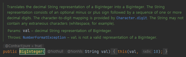 BigInteger 클래스에서 제공하는 toString 반환 포맷으로 생성자를 호출할 수 있게 구성되어 있는 것을 볼 수 있다.